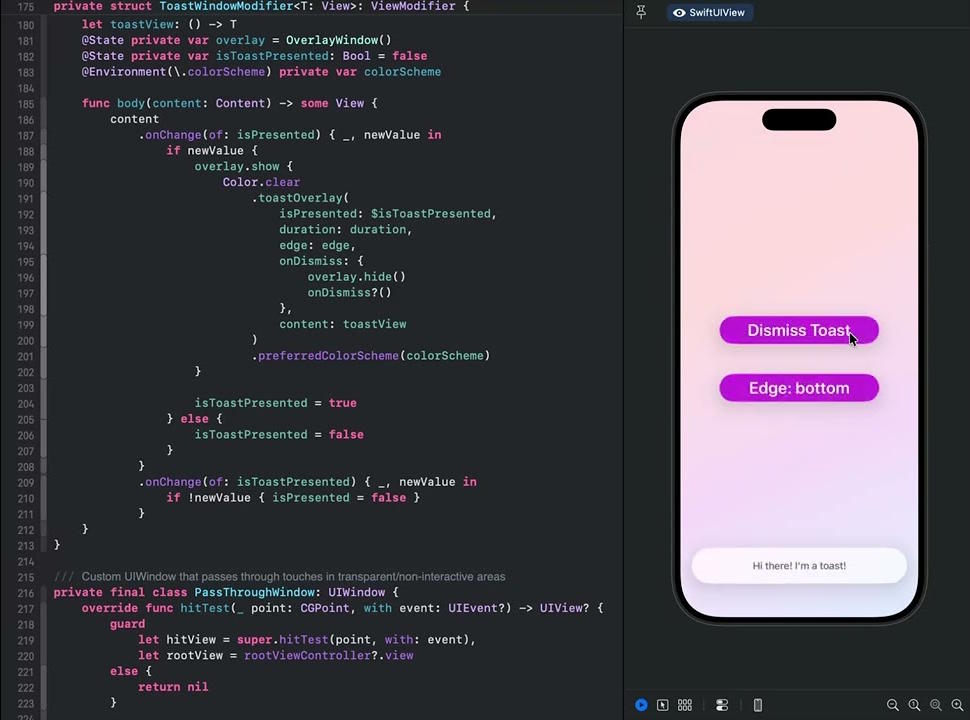 В SwiftUI до сих пор нет встроенного компонента для всплывающих уведомлений (toast). Существуют оповещения (alert) и всплывающие окна (sheet), но они, по своей сути, являются модальными. Тост решает другую проблему: оно предоставляет кратковременную обратную связь, не прерывая рабочий процесс пользователя.