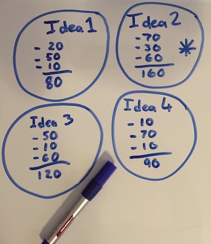 Наша продуктовая команда собирается вокруг доски и начинает накидывать идеи, иногда до 20 предложений. Что клиенты предложили, или что мы сами придумали.