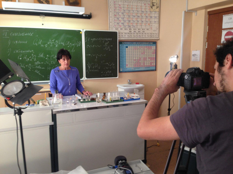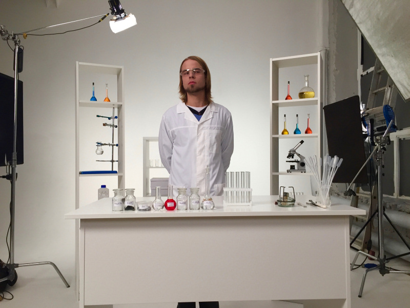 Было решено ехать в Лицей и снимать черновой вариант всех четырёх работ с лицейскими преподавателями в главных ролях. Материал получился очень ценный – именно на него мы ориентировались при подготовке чистовых съемок (сохранили алгоритм проведения работ и почти не меняли речь и комментарии преподавателя). Но, несмотря на всю позитивность и приятность в общении наших преподавателей, мы поняли, что классический школьный вариант будет довольно привычным и даже скучным для учеников. Поэтому мы решили в качестве преподавателей снимать совсем молодых преподавателей или даже студентов, разбирающихся в предмете, а в качестве концепта остановились на варианте секретной лаборатории.