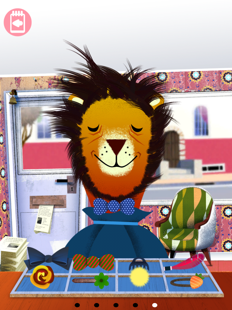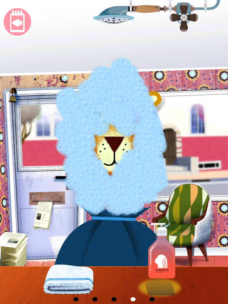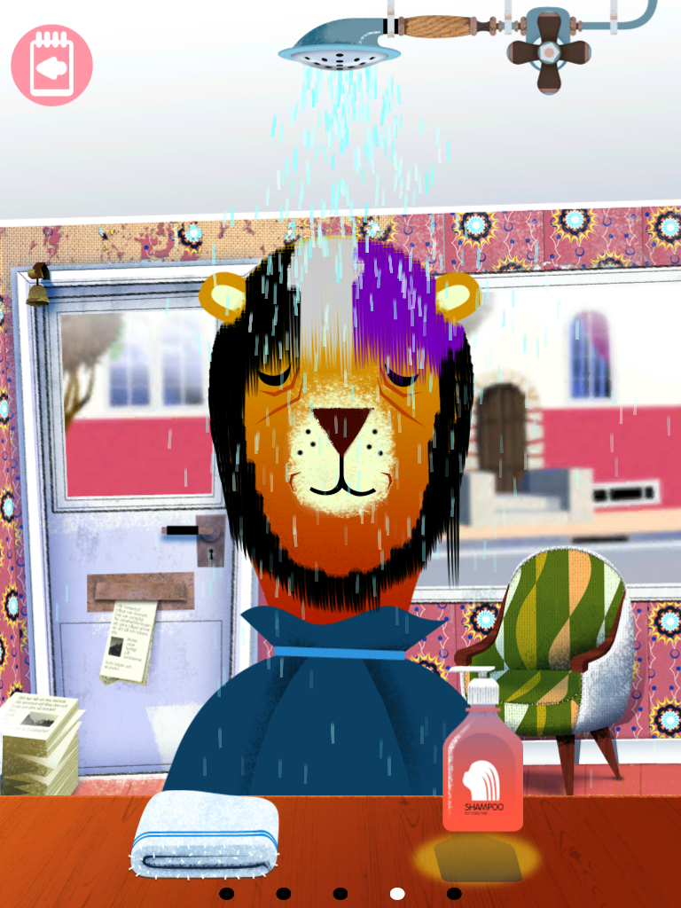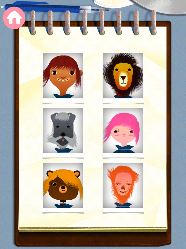 На «записи» у парикмахера шесть персонажей: лев, собака, медведь, мальчик, девочка и дядя. При выборе любого из них, «фотография» клиента вращается и раздается индивидуальный звук.