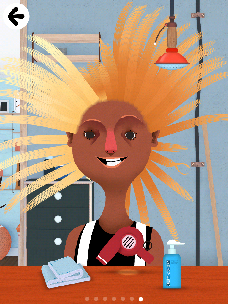 Далее все выглядит, как в настоящем салоне красоты: обои, дверь, окно с видом на улицу, герой сидит в специальной накидке. Для создания нового образа предлагаются разнообразные инструменты стилиста-парикмахера: расческа, ножницы, жидкость для роста волос (если постригли слишком коротко, например), фен, машинка для стрижки, различные краски, полотенце, шампунь, аксессуары, кран с водой и фотоаппарат, который поможет сохранить результат. Выбор каждого предмета сопровождается звуком, а их применение довольно реалистично и синхронизировано с прикосновениями пальцев игрока. К примеру, краска для волос ложится не блоками, ее нанесение можно регулировать; вода из крана не отключается автоматически.