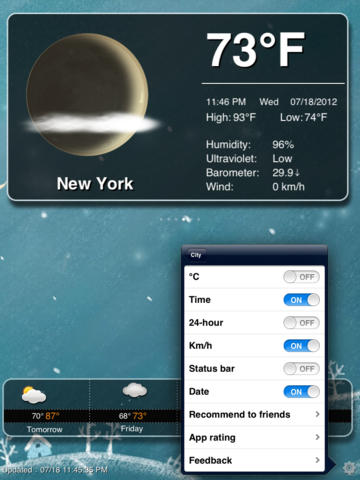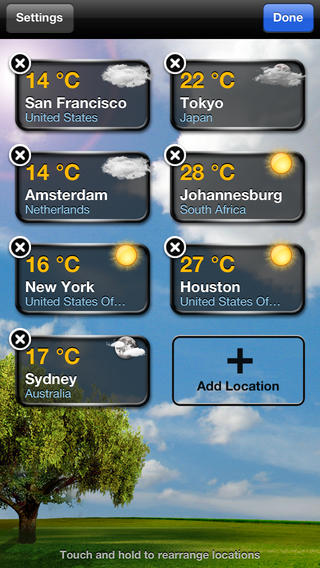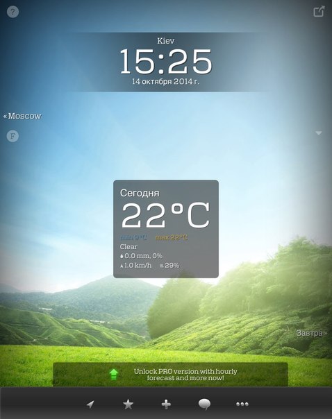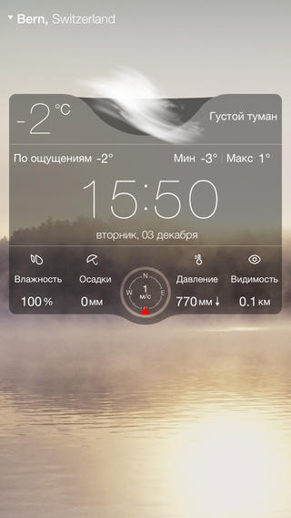 Приятное приложение с оригинальными эффектами переключения между различными окнами. Расположение и дизайн времени, даты и названия города изящно имитируют страницу «Домой» на iOS. Фон зависит только от погоды — дождливо, облачно или солнечно сразу понятно по фотографиям синего неба или барабанящих по асфальту каплей. С помощью свайпов можно легко переходить к другим локациям или погоде на ближайшие дни. При этом поменять единицы измерения и узнать температуру и осадки на следующие 3 дня можно прямо на стартовой странице.