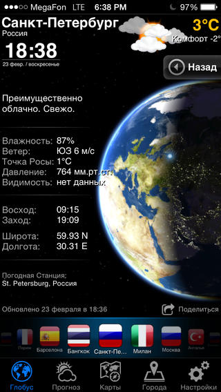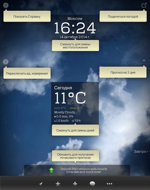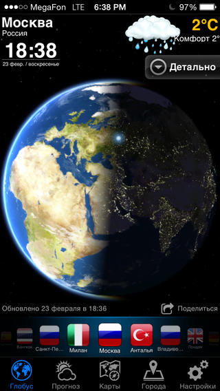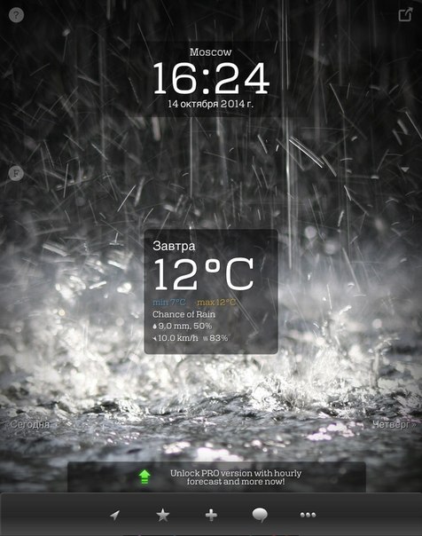 WeatherNow позволяет посмотреть карты с различными данными — облачность, осадки, давление, ветер, температура по всей планете. Подробный прогноз на ближайшие двое суток позволит сориентироваться, если вы уезжаете куда-то на выходные. Это приложение показывает Землю из космоса и разрешает ее вращать — просто для развлечения. В расширенной версии доступно отображение текущей температуры на иконке приложения, график температуры на 15 дней и некоторые другие функции.