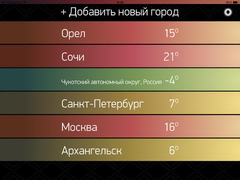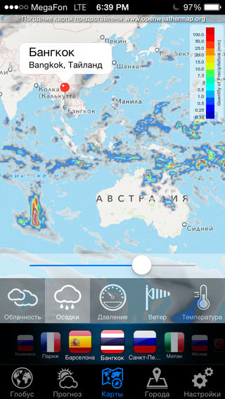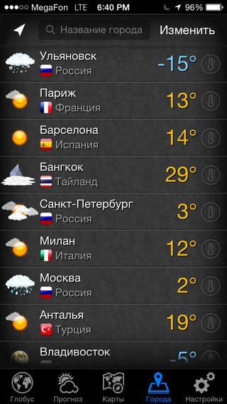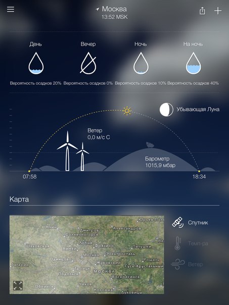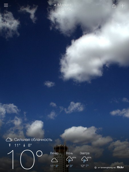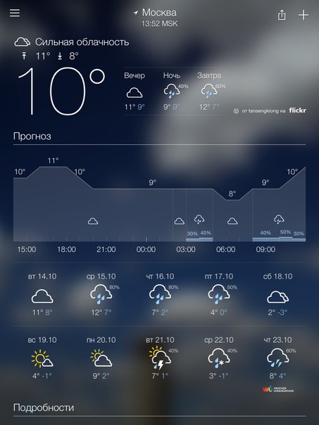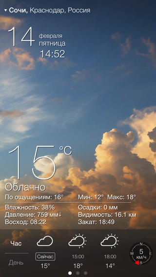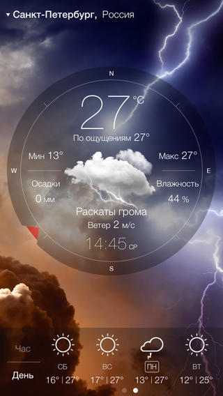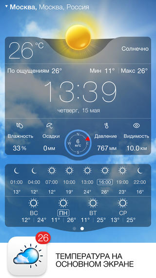 Приложение от другого крупного поисковика Yahoo! не зря было удостоено награды Apple Design Award в 2013 году. Оно порадует пользователей фотографиями городских видов, которые не только яркие и насыщенные, но и отражают текущую погоду. Есть возможность вертикального и горизонтального поворота, в отличие от Яндекса. Легкий свайп вниз изящно раскрывает подробную информацию: с графиком температурных изменений, прогнозом на неделю, вероятностью осадков и даже картами — спутниковой, температурной и с данными по скорости ветра. Все минималистичные значки анимированы. Можно подключить ежедневные уведомления о погоде — как раз для тех, кто вечно спешит и теряется в массе загруженных приложений.