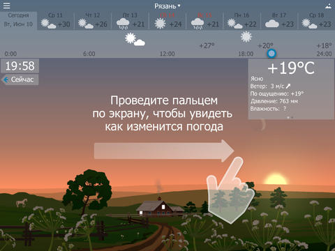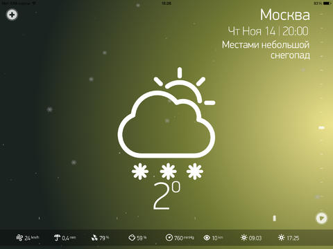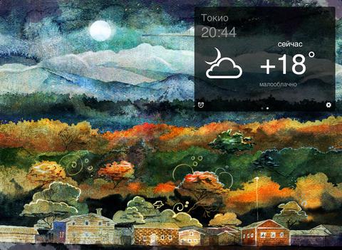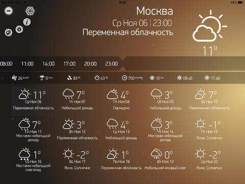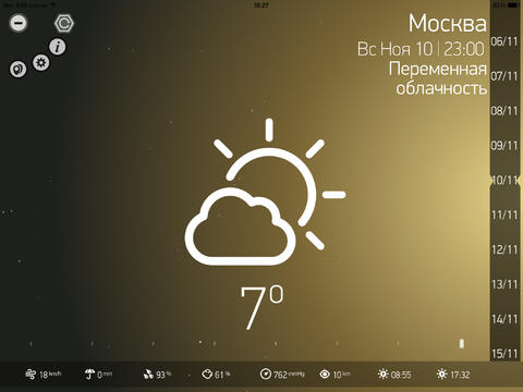 Уютный пейзаж, меняющийся в зависимости от выбранного города, позволяет отследить погодные изменения. Чтобы посмотреть, как будет меняться вид за окном в ближайшие дни, достаточно провести пальцем по экрану. При желании одним тайпом можно отобразить подобную информацию с прогнозом на неделю. Из полезного — указано ощущение температуры на улице, а из нестандартного — долгота дня, фаза Луны, видимость и точка росы.