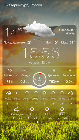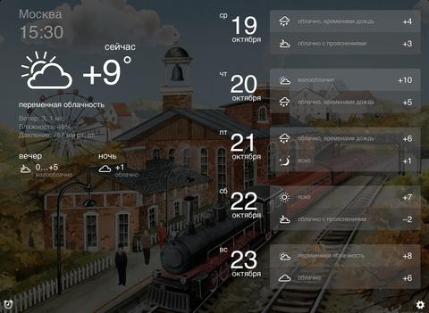 Очень красивое и сделанное с фантазией приложение от Яндекс. Большую часть экрана занимает иллюстрация, на которой едет поезд, ходят люди, летают бабочки, поют птички, а при нажатии на некоторые предметы можно наткнуться на новые сюрпризы. Прозрачное окошко с информацией о погоде разворачивается одним тайпом до прогноза на неделю вперед. Оно выполнено в лаконичном дизайне, который не мешает просматривать массу показателей — температуру, осадки, ветер, влажность, давление. Можно включить часы, добавить неограниченное количество городов (во многих приложениях эта функция платная), даже установить будильник. Отдельно стоит отметить дизайн иконки приложения, которая имитирует открытое окно.