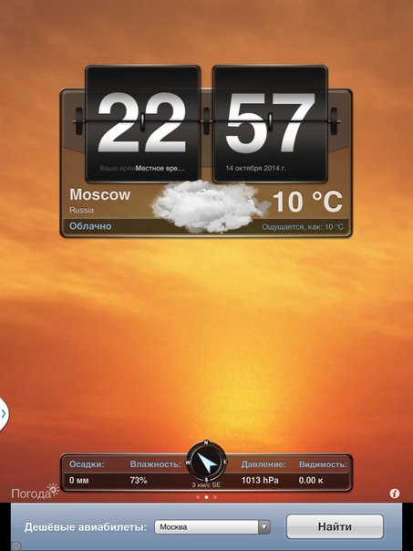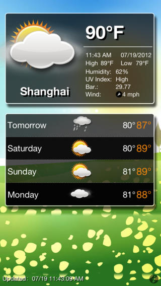 Мультяшные вращающееся солнышко, самолетики, облачка в этом приложении сочетаются с лаконичным по дизайну текстом о самой высокой и самой низкой температуре в течение дня, влажности, давлении, скорости ветра и времени. В нижней части экрана выведен прогноз на следующие четыре дня. Animation Weather не полностью русифицировано, и это ощущается при его использовании как небольшой недостаток. Так, необходимо помнить, что дата выводится в формате месяц/день/год.