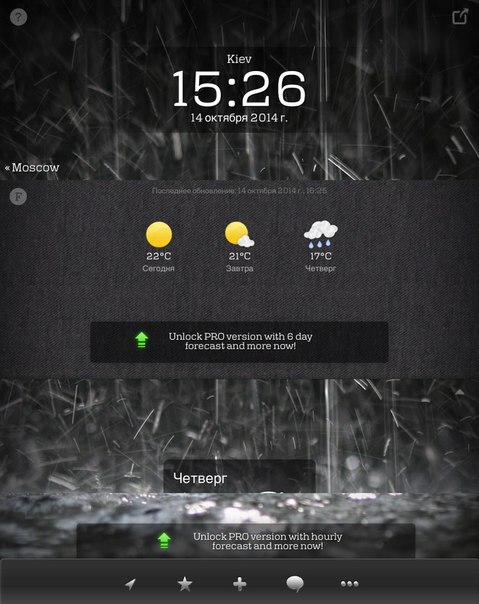В Weather Book в первую очередь привлекает простой дизайн, приятная цветовая гамма и анимация осадков и ночи. Информация о погоде обновляется каждые 3 часа. Легкий свайп вниз открывает прогноз на две недели с указанием температуры и осадков. Шкала справа позволяет быстро переходить к каждому из следующих дней. Внизу экрана отображена информация о силе ветра, влажности, вероятности осадков, атмосферном давлении, восходе и закате солнца.