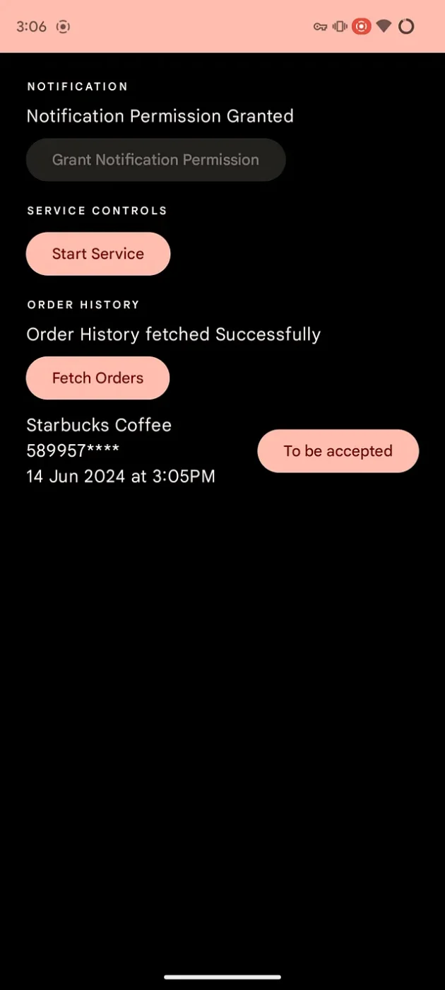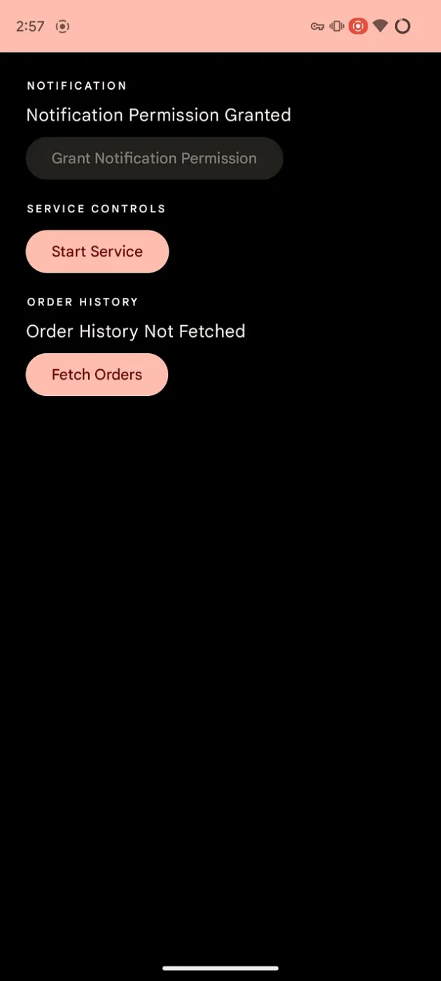 Теперь, когда дизайн и система понятны, пришло время воплотить идею в жизнь. Я начал с реализации MainActivity с помощью Jetpack Compose. MainActivity состоит из трех кнопок, первая кнопка предназначена для запроса разрешения POST_NOTIFICATION для приложения, вторая кнопка служит для запуска Foreground службы, а последняя кнопка используется для просмотра истории заказов. При нажатии на кнопку “Получить заказы” приложение вызывает online_order API и фильтрует результаты, в которых статус заказа не “Доставлен”. Отфильтрованные заказы — это те заказы, которые активны в данный момент.