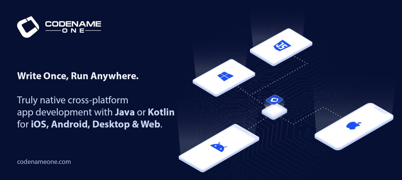Codename One — это кроссплатформенная среда разработки для Java и Kotlin, ориентированная на мобильные устройства. Она позволяет компилировать байт-код Java в исполняемые файлы нативных ОС (iOS, Android, UWP и т. д.). Это полноценная мобильная платформа, включающая виртуальные машины, симулятор, инструменты проектирования (визуальные темы/конструктор/CSS), интеграцию с IDE, портирование на различные ОС и многое другое. Она обеспечивает полный доступ к базовому нативному коду ОС (например, Objective-C, C#, Dalvik/ART) через переносимую абстракцию, что обеспечивает 100% повторное использование кода.