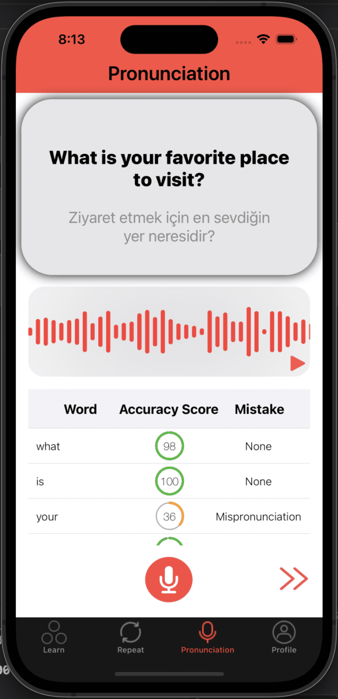 English Pronunciation App — готовое приложение для изучения английский слов и тренировки их произношения. Сделано на MVC, Swift, XIB, Microsoft Azure Cognitive Speech, Firebase.