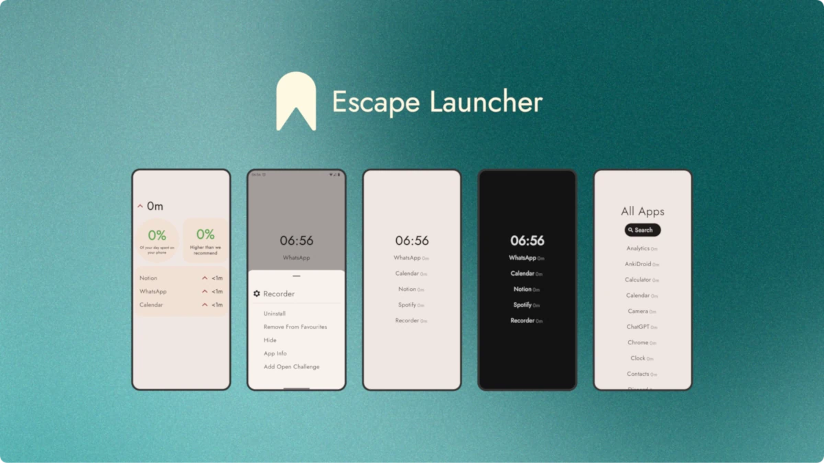 Escape — минималистичный лаунчер для Android 8.1 и выше. Он имеет современный, простой и настраиваемый дизайн со списком приложений на главном экране и дополнительными часами с виджетами, а также поддерживает цветовые схемы Material UI и такие функции, как скрытые приложения.