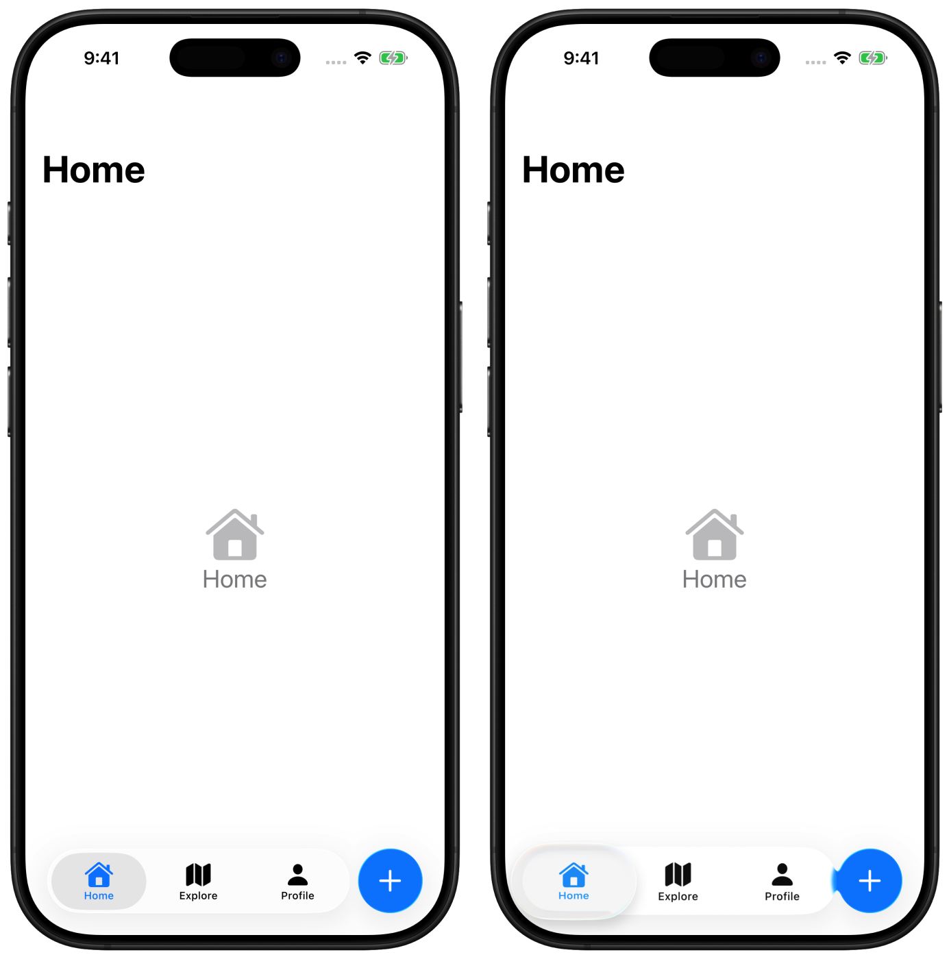 Почему UIKit? FabBar манипулирует внутренней иерархией представлений UISegmentedControl, чтобы скрыть собственные метки и наложить пользовательские представления. Это невозможно с помощью Picker из SwiftUI. Кроме того, смешивание пользовательских элементов управления UIKit с методом .glassEffect() из SwiftUI вызывает проблемы с частотой кадров во время сенсорного взаимодействия.