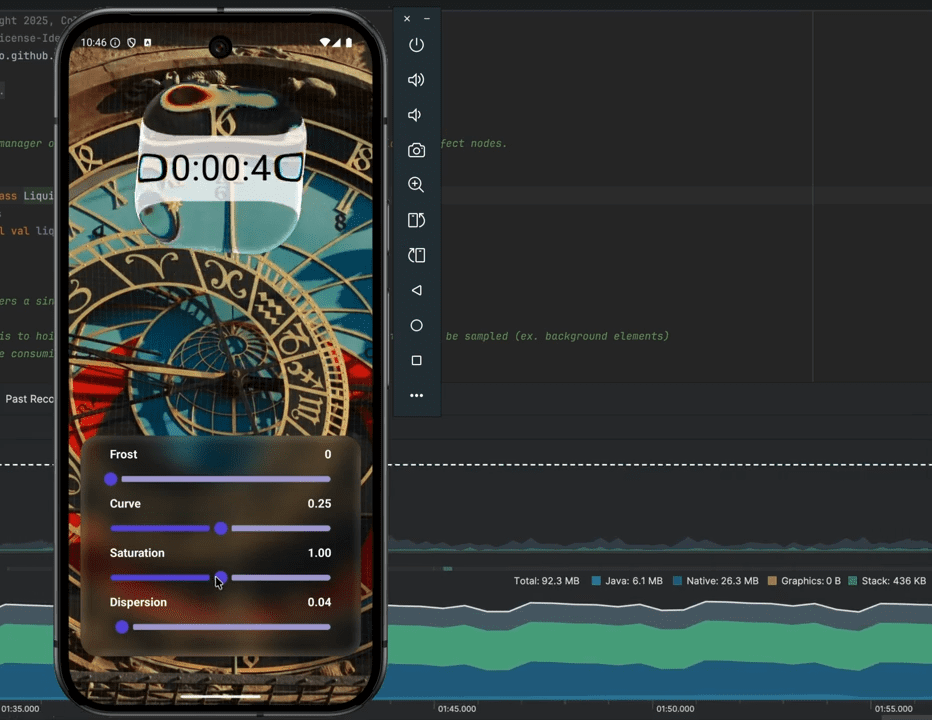 Liquid добавляет эффекты в стиле Liquid Glass в Jetpack Compose. Он позволяет преломлять, замораживать и искривлять содержимое за элементами пользовательского интерфейса, создавая динамические эффекты матового стекла, линз или жидкости.
