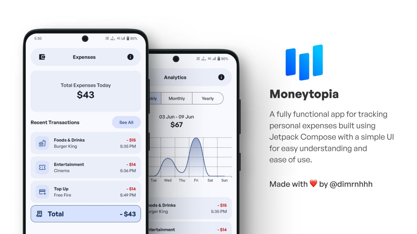 Moneytopia — полнофункциональный личный трекер расходов, созданный с помощью Jetpack Compose и Material 3. Благодаря чистому и интуитивно понятному дизайну он делает управление финансами простым и легким, помогая вам с легкостью контролировать свои расходы.