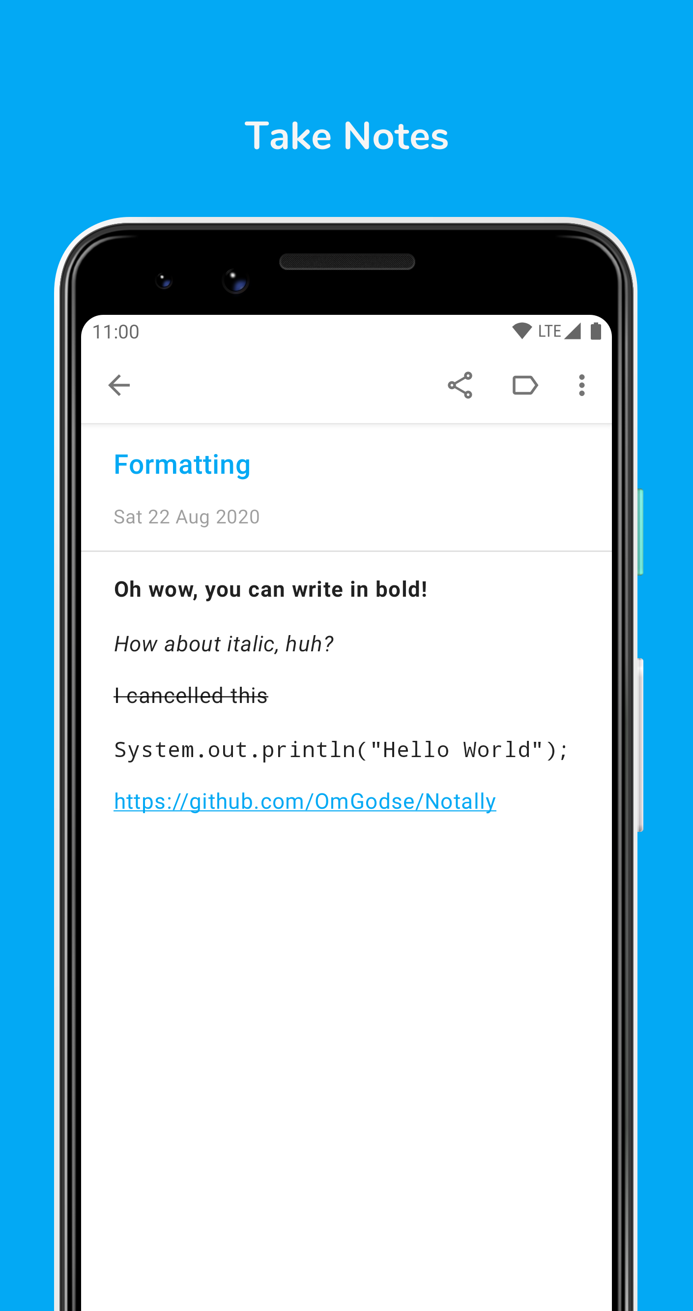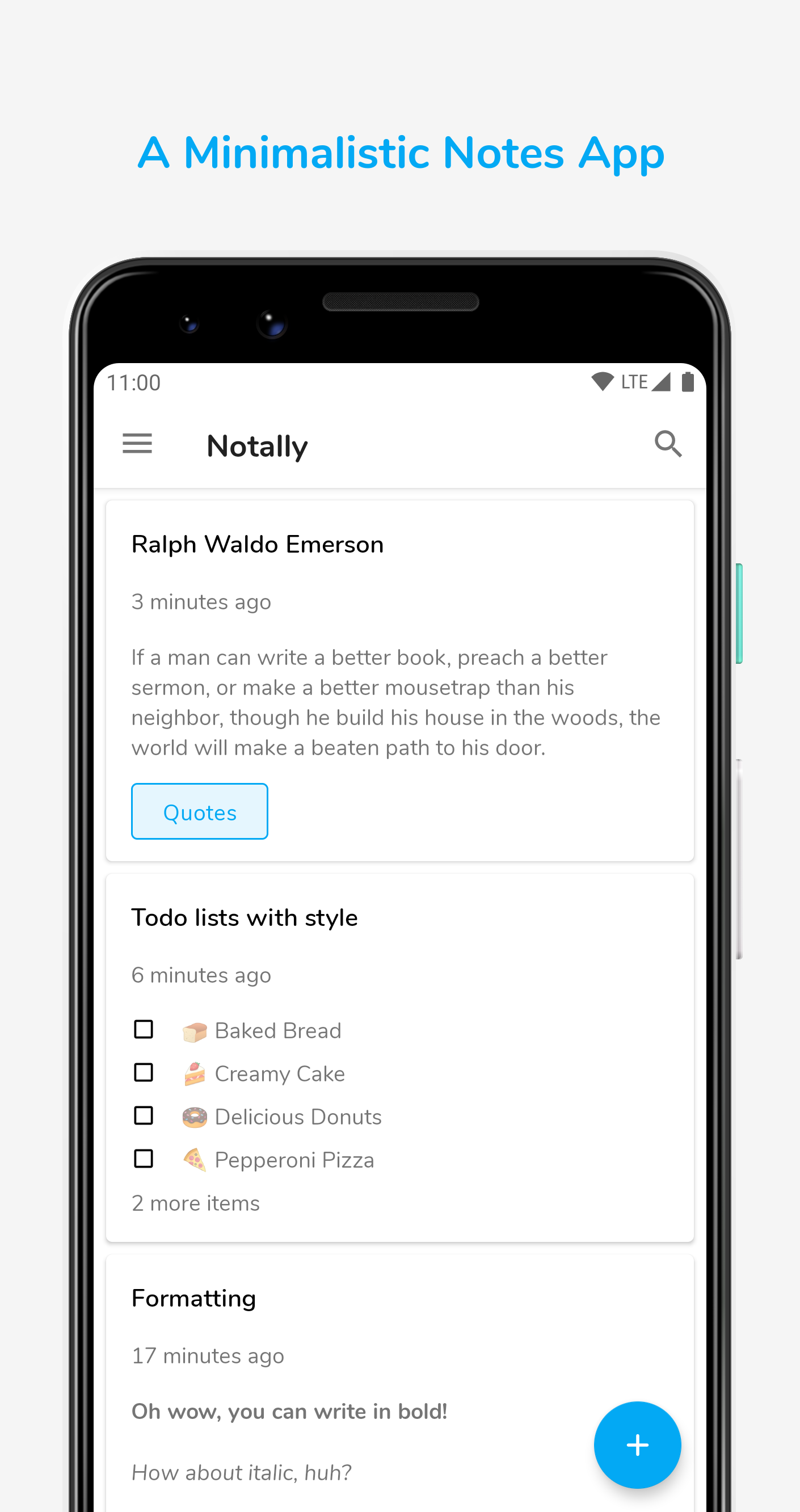 Notally — минималистичный блокнот с материальным дизайном, работающий на основе XML-файлов. Умеет делать rich text, ссылки, автосохранение, темную тему, работать со списками, метками, экспортировать заметки в разные форматы.