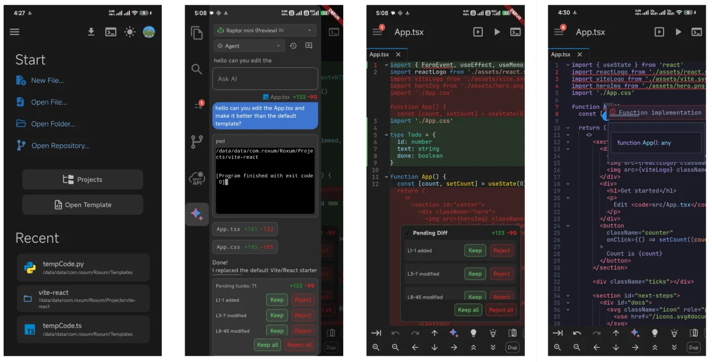 Roxum IDE — это ориентированный на мобильные устройства редактор кода и мини-IDE для Android, созданный на основе Flutter. Он объединяет в одном приложении редактирование, работу в терминале, инструменты Git/GitHub, ИИ-помощь, загрузку runtime файлов и широкие возможности настройки.