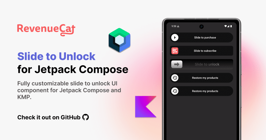Slide to Unlock — полностью настраиваемый слайдер для Jetpack Compose и KMP от RevenueCat. Вы можете легко реализовать функцию разблокировки слайдером с помощью композабл SlideToUnlock. Он предлагает интуитивно понятные возможности настройки цветов, текста, форм и даже всего содержимого миниатюры и подсказки, позволяя создавать широкий спектр стилей.
