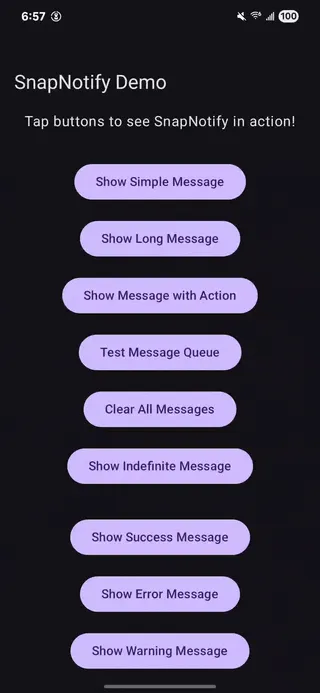 SnapNotify — легковесная, потокобезопасная библиотека Snackbar для Jetpack Compose с предельно простой настройкой. Показывайте снекбары из любого места с красивой стилизацией, управлением очередью и опциональной интеграцией с Hilt. Полностью на Kotlin.