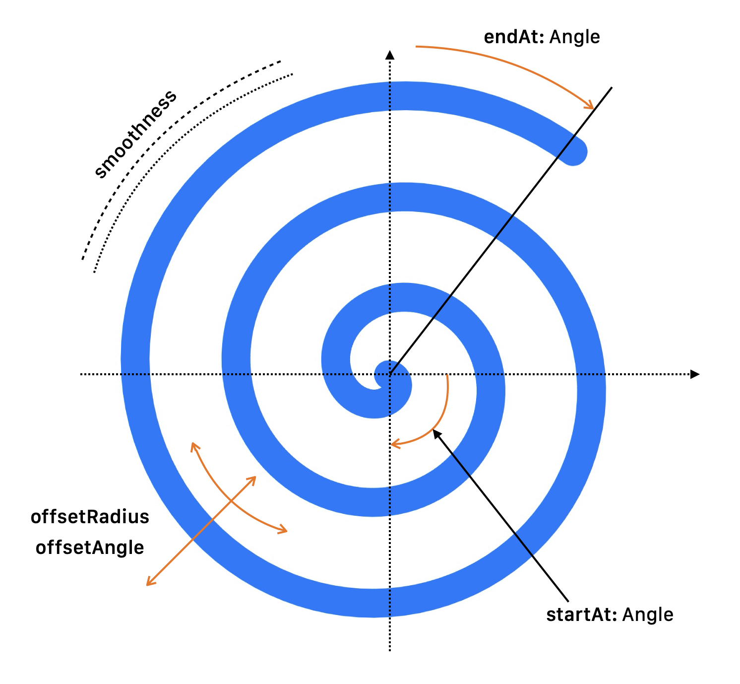 Spiral — библиотека рисования спиралей в SwiftUI для macOS, iOS и watchOS. В ней есть генератор точек, Shape и View спирали. Генератор точек позволяет использовать данные для непосредственно рисования спирали по точкам. Shape может быть обведена или заполнена желаемым материалом. View позволяет размещать произвольные view в точках спирали.