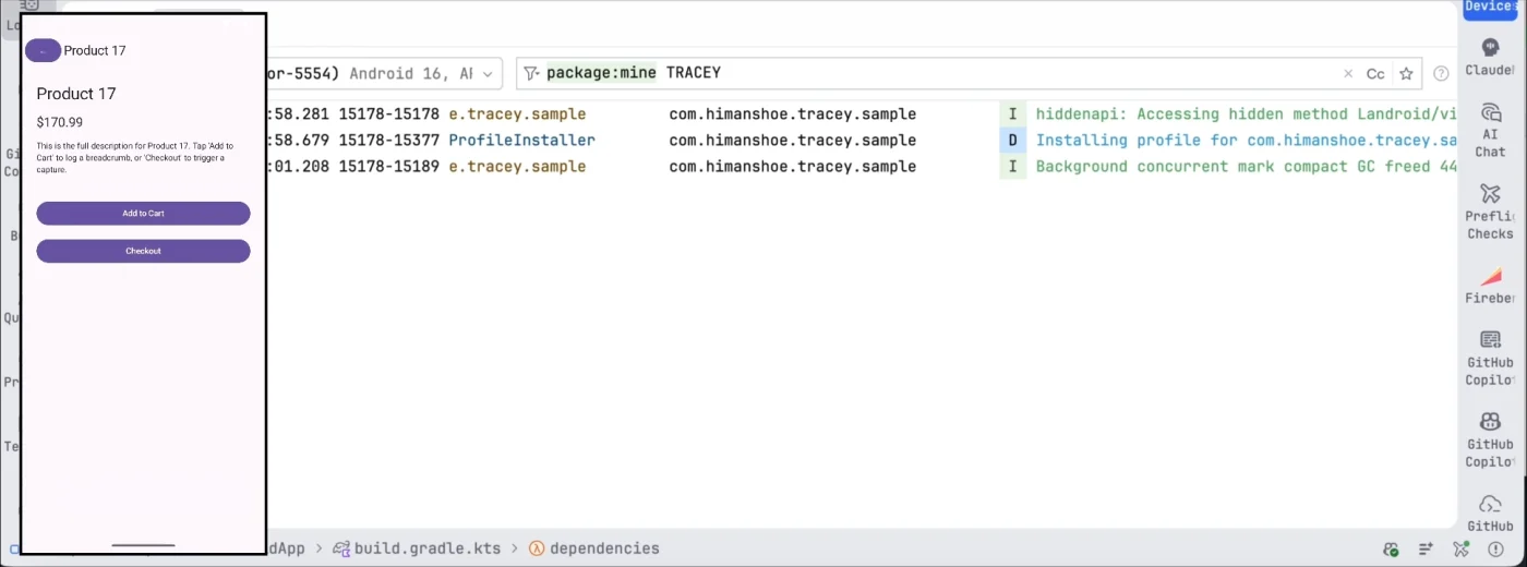 Tracey — Kotlin Multiplatform SDK для Android и iOS для записи жестов, просмотров экранов, навигационных цепочек и сбоев — с последующим воспроизведением их в виде таймлайна.