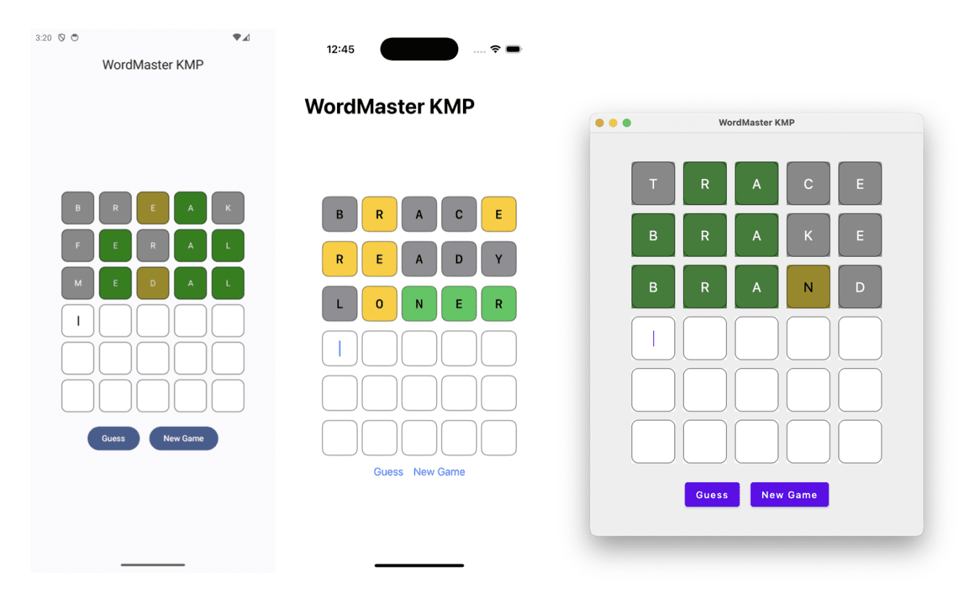 WordMasterKMP — приложение на Kotlin Multiplatform, вдохновлённое игрой Wordle, а также примерами Word Master и Wordle-solver. Основная логика/состояние игры включены в общий код KMP, а поверх этого реализованы клиенты для iOS (SwiftUI), Android (Jetpack Compose) и десктопов (Compose for Desktop).