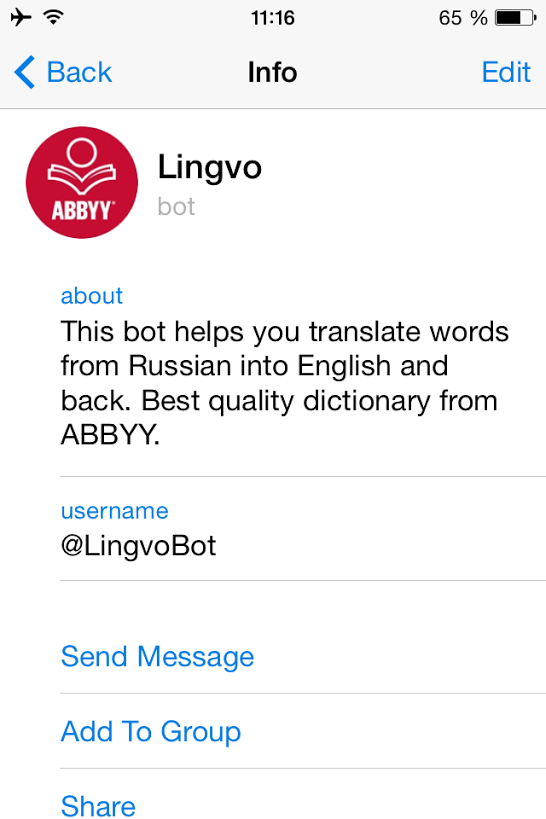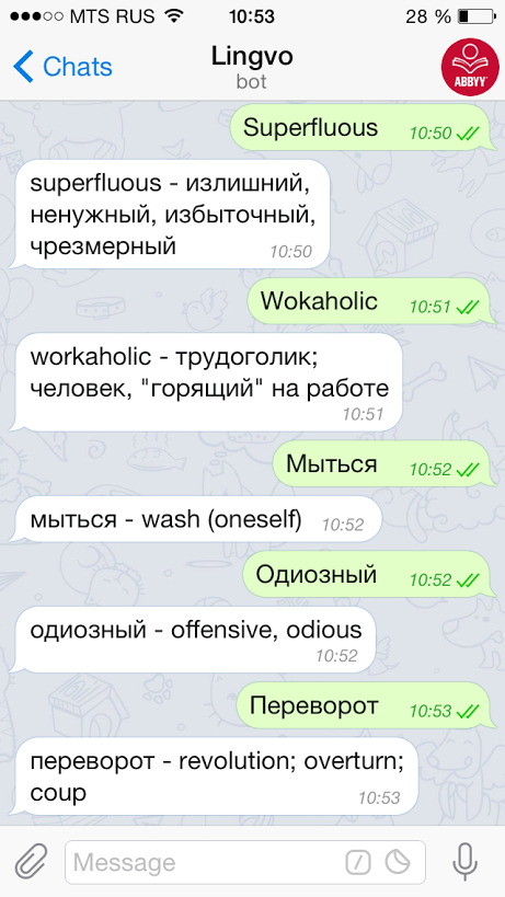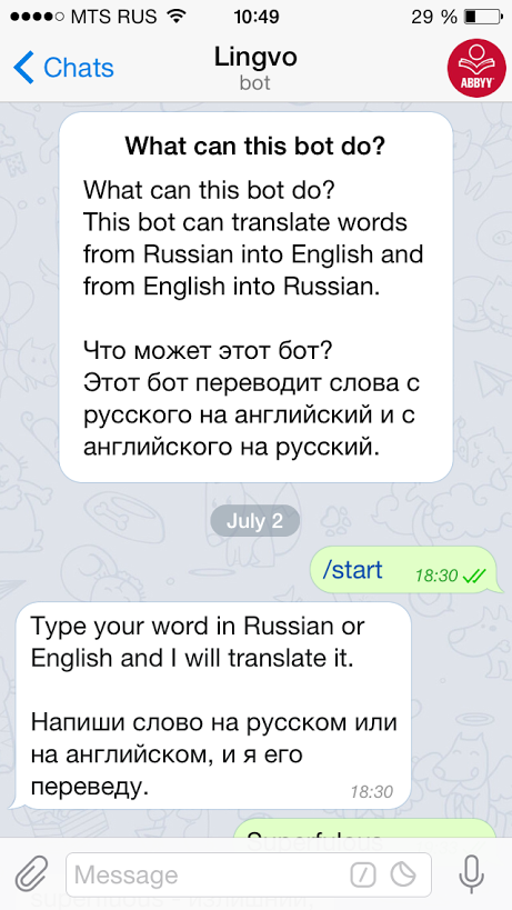 Благодаря боту от ABBYY, пользователю Telegram не нужно искать перевод незнакомого слова в другом приложении. Достаточно начать диалог с @LingvoBot и отправить ему незнакомое слово. Значение мгновенно придет ответным сообщением.