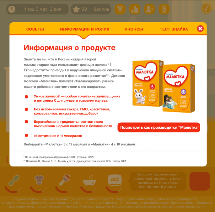 Красочный, удобный интерфейс, живая анимация и звуковое сопровождение делает приложение особенно привлекательным для мам. Многообразие игровых активностей дополняется актуальным для целевой аудитории контентом о гармоничном развитии детей, возможностью получить рекомендацию эксперта по питанию и узнать о продуктах бренда «Малютка» и текущих акциях.