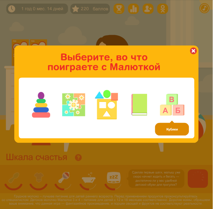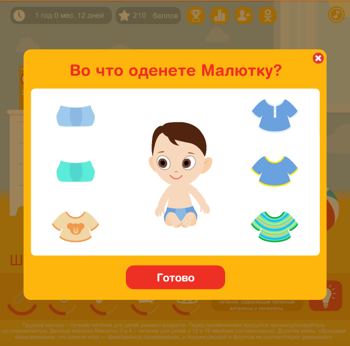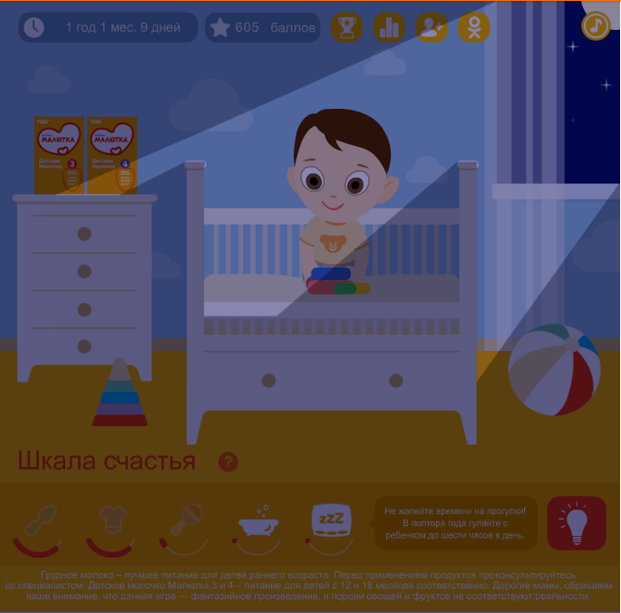 Проект посвящен важным аспектам питания и гармоничного роста малыша после года. Благодаря приложению мама сможет получить полезную информацию о рационе ребенка на втором году жизни, и, в частности, о продуктах бренда «Малютка»: «Детское молочко» МАЛЮТКА 3 для питания детей с 12 месяцев и «Детское молочко» МАЛЮТКА 4 с 18 месяцев. Обновленный игровой симулятор – это целый виртуальный мир с широкими возможностями: малыша можно кормить, переодевать, купать, укладывать спать. Пользователи также могут с ним играть, например, собирать пазл, пирамидки, сортер, кубики или читать книгу.