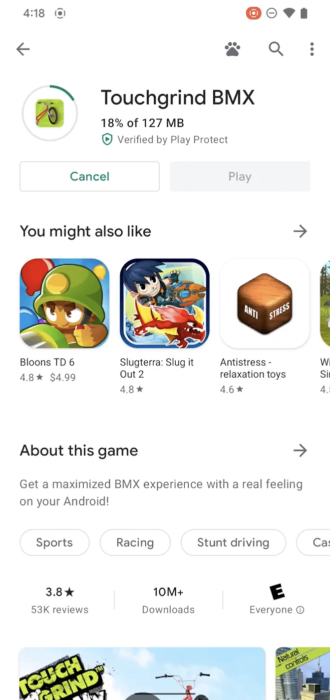 Другая новитна Android 12 — это функция «Играть при загрузке» (Play as You Download). Как и раньше, пользователь может найти игру в списке в Play Store. На кнопке «Установить» теперь будет значок молнии, который сигнализирует о том, что можно начать играть, в то время как оставшиеся ресурсы будут загружаться в фоновом режиме. В одном примере кнопка «Играть» отображалась уже при загрузке 18% из 127 Мб. Google планирует, что «игры будут готовы открываться как минимум в 2 раза быстрее».