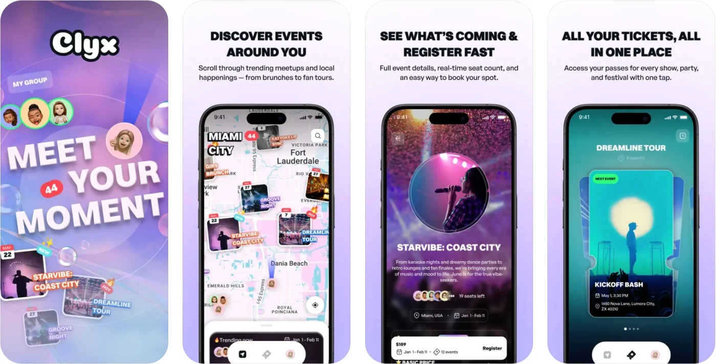 Сама платформа Clyx довольно проста: она собирает данные о мероприятиях с таких сайтов, как Ticketmaster и TikTok, и показывает пользователям мероприятия в их городах, на которые они могут зарегистрироваться. Приложение также предлагает рекомендации мест для посещения, а пользователи могут загружать свои контакты в приложение, чтобы видеть, какие мероприятия посещают их друзья.