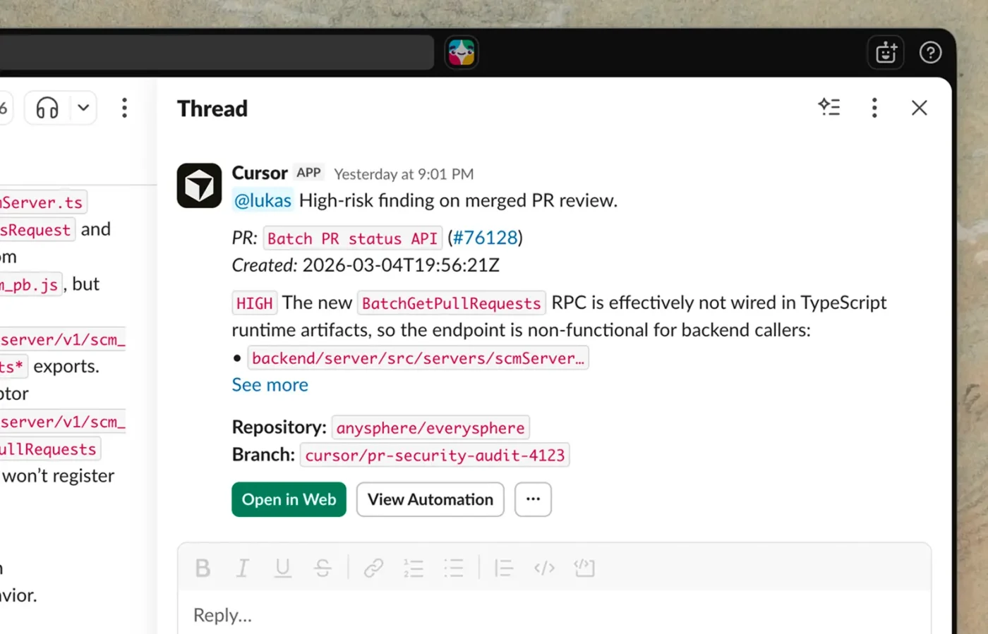 Одним из ранних примеров является Bugbot, давняя функция Cursor, которую команда рассматривает как предшественницу более широкой системы автоматизации. Система Bugbot запускается каждый раз, когда инженер вносит изменения в кодовую базу и проверяет новый код на наличие ошибок и других проблем. Используя автоматизацию, Cursor смог расширить эту систему для более сложных проверок безопасности и более тщательных обзоров.