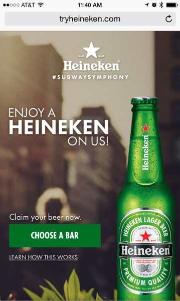 При помощи сети ресторанов и баров Gratafy компания просит людей, достигших совершеннолетия, ввести свой номер смартфона в рекламе. На него высылается ссылка, при переходе на сайт она показывается список фирменных баров в округе, а также трехзначный код, автоматически меняющийся каждые 12 часов, который дает возможность получить бесплатное пиво (правда, один пользователь может получить всего одно пиво).
