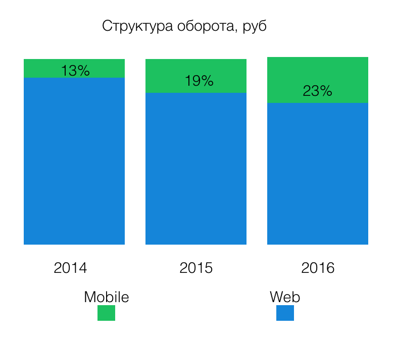 Доля выручки с мобильных устройств выросла на 21% п.п. и достигла 23% от общего оборота компании. В мобильном сегменте лучше всего показали себя пользователи приложения на платформе iOS — рост выручки в данном сегменте составил 69% по отношению к 2015 году. Выручка в 2016 году через приложение на платформе Android увеличилась на 27% относительно предыдущего года.