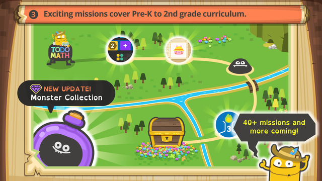 Чтобы поддерживать вовлеченность детей, Todo Math использует модель игры, в которой дети могут почувствовать себя исследователями, находя сундуки с сокровищами и другие награды по мере прохождения уровней.