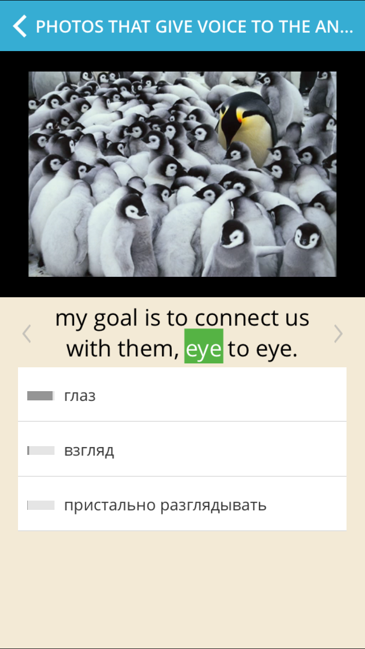 Пользователям iPhone и iPad приложение покажет, как пользоваться плеером при первом открытии раздела TED Talks. Коллекция материалов полностью повторяет представленную на сайте сервиса и обновляется одновременно с последней. О появлении новых выступлений напоминает Лео на домашней странице приложения. Под каждым видео размещаются субтитры, по которым можно кликать, чтобы получить перевод незнакомых слов. Проигрывание записи при этом останавливается, чтобы зритель имел возможность перевести и понять текст. После добавления в словарь пяти незнакомых слов появляется окошко, предлагающее сразу выучить новую лексику. Тренировку можно отложить, вернувшись к просмотру видео.