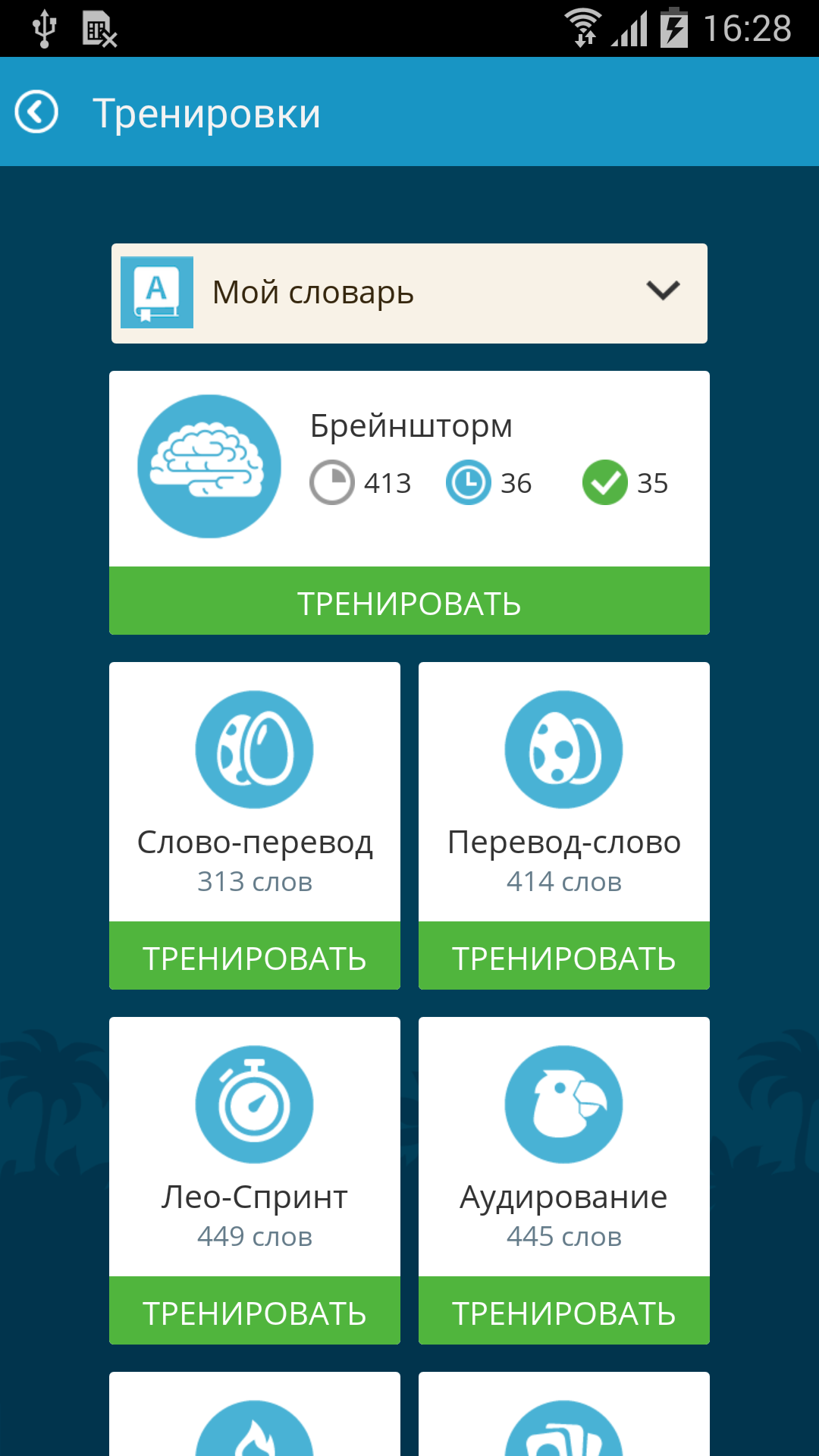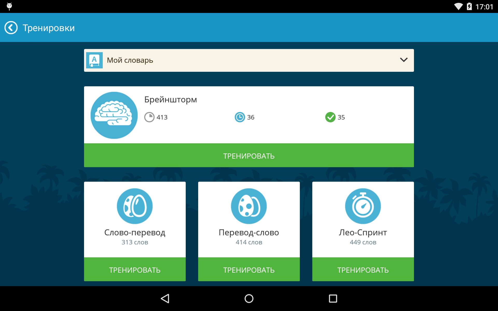 «Брейншторм», с которым пользователи LinguaLeo знакомы по сайту сервиса, появился у владельцев смартфонов и планшетов на Android в приложении сервиса. Эта функция позволяет не только учить перевод слов, но и тренировать их написание и восприятие на слух. В приложении можно за раз выучить 5 слов из персонального словаря, в отличие от «Брейншторм», на сайте, где пользователь тренирует 6 слов. Это создано для сокращения времени, которое требуется для одного подхода, и наиболее удобно для обучения на мобильных устройствах. В среднем, потребуется около 3-х минут на каждые новые 5 слов. Обучаться можно не подключаясь к сети, предварительно синхронизировав приложение с сайтом, чтобы убедиться, что лексика загружена на устройство.