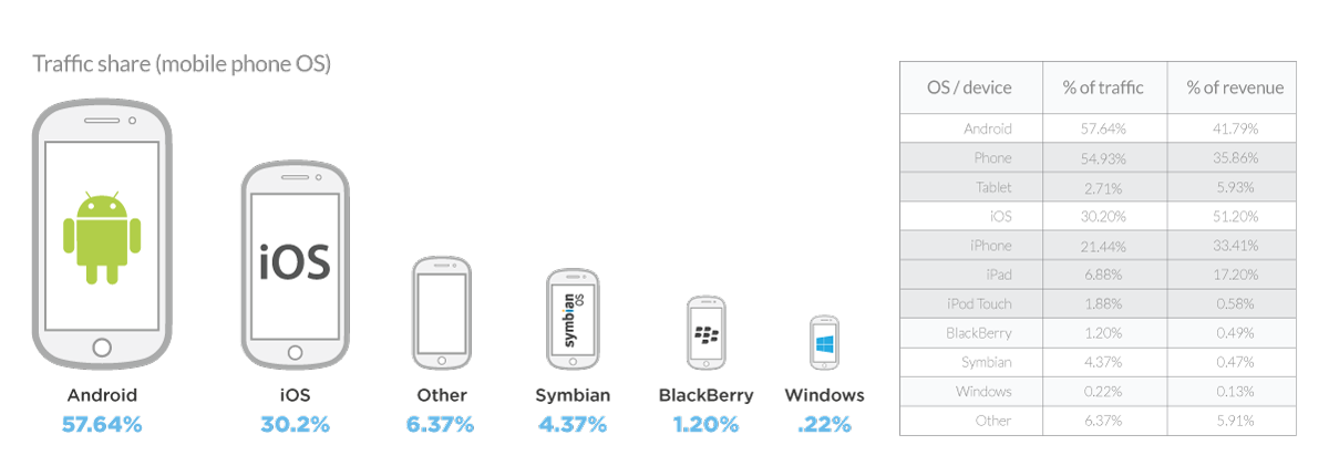 Платформа Android продолжает сокращать отставание от iOS по доходам от мобильной рекламы. При этом количество показов мобильной рекламы на Android уже почти в два раза выше, чем на iOS, согласно отчету State of Mobile Advertising от компании Opera Mediaworks. Ранее в этом году Android впервые превзошел iOS по этому показателю. Разрыв усилился в третьем квартале 2014 года: на устройства Android приходится 58% всех показов мобильной рекламы против 30% на iOS.