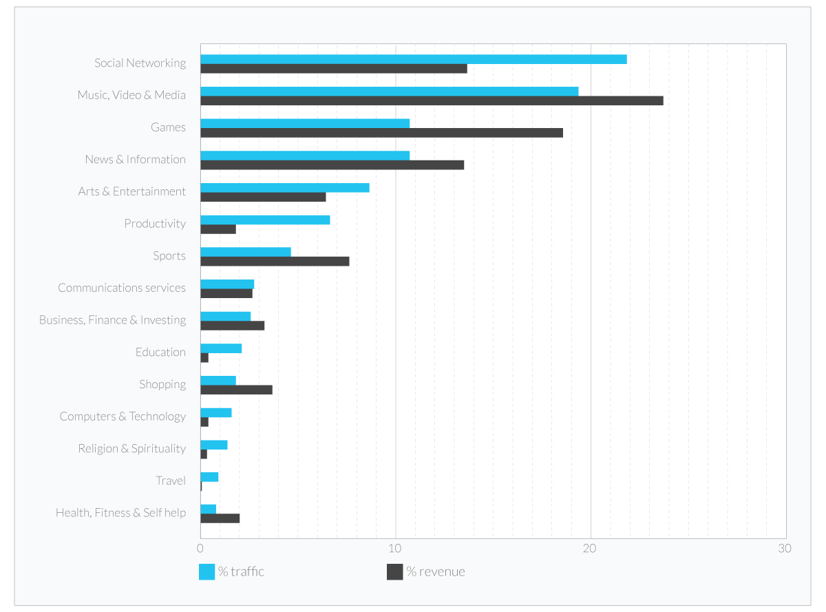 Социальные сети по-прежнему являются наиболее популярной категорией: на них приходится каждый пятый показ мобильной рекламы. В то же время, сайты и приложения в категории «Музыка, Видео и Медиа» получают больше всего дохода от мобильной рекламы – 23% от общемировых доходов.