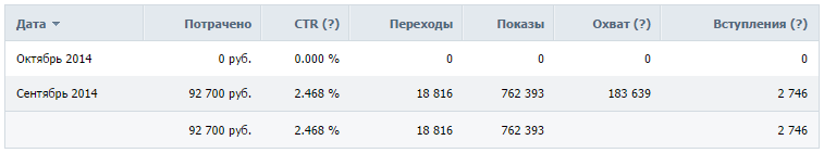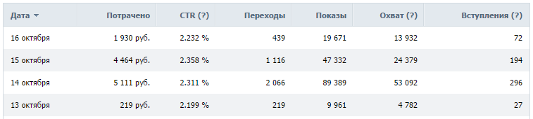 Мы пообщались с поддержкой ВК по проблеме аукциона и по поводу завышенной рекомендованной ставки, но тем не менее в течение первой недели вопрос оставался открытым. Соответственно, кампания была приостановлена, а возобновили мы ее только 13 октября – к этому времени техническими специалистами ВК был предпринят комплекс мер по исправлению ситуации.