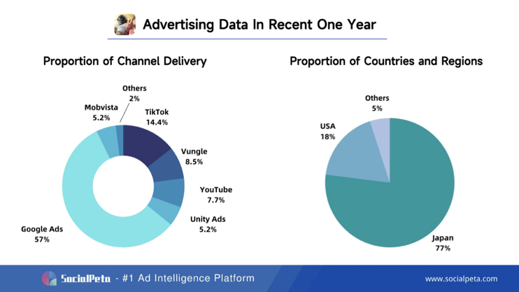 KNIVES OUT – это игра в жанре battle royale shooter, похожая на PUBG. Игра была официально запущена в 2017 году с основным рынком в Японии. По данным SocialPeta, за последний год большинство креативов для игры было размещено в Японии – около 77%, за ней следуют США – около 18%.