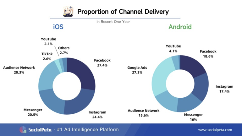 На медиабаинг для Genshin Impact было потрачено немало средств. По данным SocialPeta, по состоянию на 9 февраля 2022 года для игры было использовано более 20 000 наборов дедуплицированных креативов на iOS и Android вместе взятых. Судя по рекламным данным за последний год, любимыми рекламными платформами Genshin Impact являются Facebook (на iOS) и Google Ads (на Android).