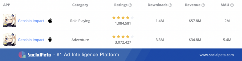 Прошло уже больше года с момента выхода игры, а Genshin Impact все еще сохраняет высокие показатели роста. По данным SocialPeta, в январе 2022 года игра была загружена более 4,7 миллиона раз на iOS и Android вместе взятых, зарегистрировав более 7,4 миллиона ежемесячных активных пользователей; она принесла доход более 9,2 миллиона долларов США на iOS и Android вместе взятых, доказав свой большой потенциал для получения дохода.
