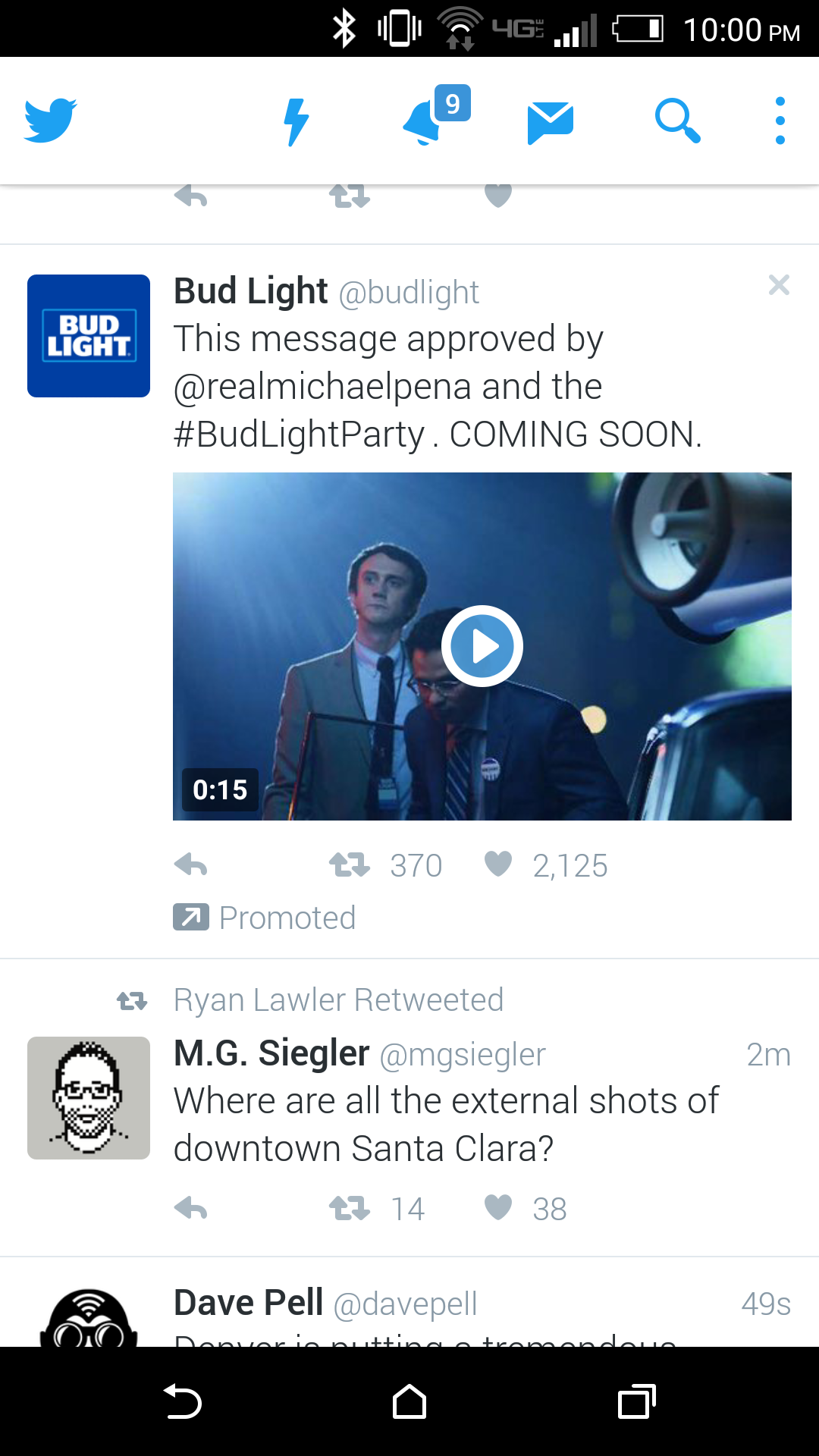 Что хочется выделить, так это любопытный маркетинговый подход. Джерреми Сакко из компании Fiksu, как и миллионы людей, смотрел игру с телефоном в руке, переключаясь между Twitter, Facebook и другими сайтами, и читал о чем говорят люди. В процессе этого он заметил, что несколько ТВ рекламодателей на Суперкубке используют тактику, которую он просто обожает: сопровождение своих ТВ инвестиций таргетированными сообщениями на мобильных. Вот несколько примеров: