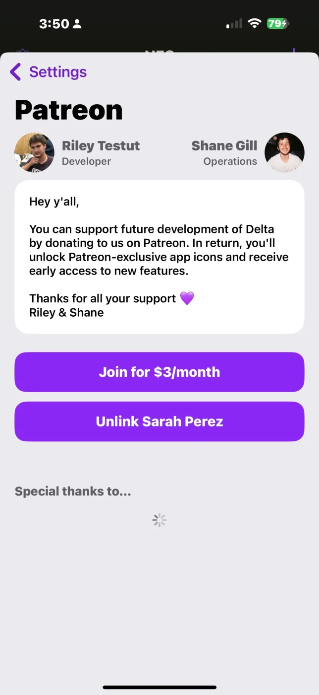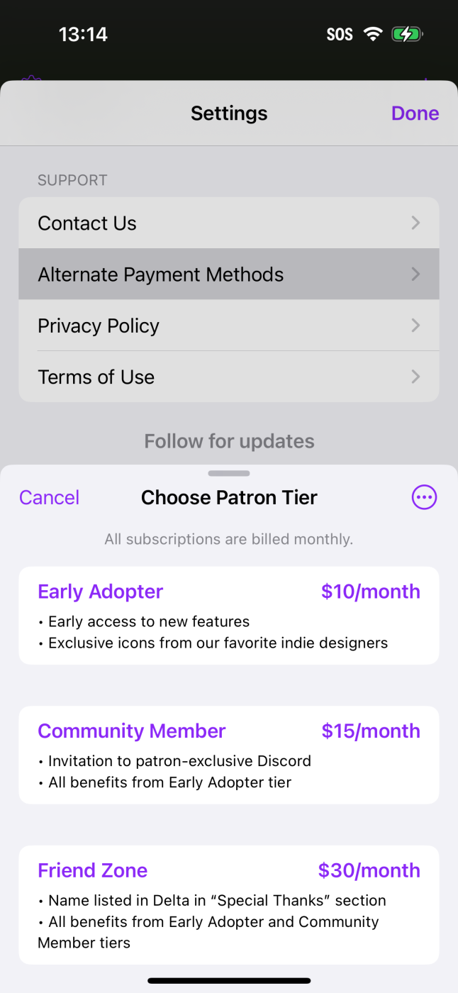 В обновленной версии приложения-эмулятора игр Delta пользователям предлагается «Присоединиться к нашему Patreon» на экране настроек приложения. Здесь они могут нажать на кнопку, чтобы подписаться на членство Delta в Patreon за $3 в месяц, которое предоставляет доступ к эксклюзивным функциям и другим преимуществам.