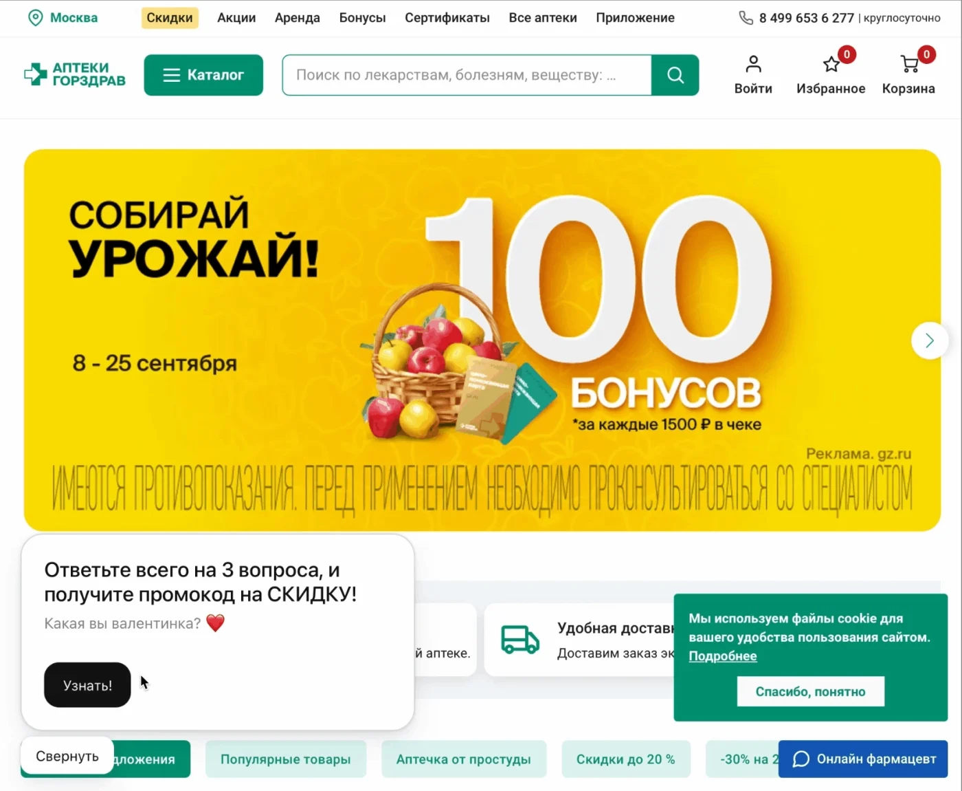 Эффективность квизов подтверждается практикой. Например, сеть аптек «36.6» заменила квизами заменили стандартные скидочные акции, конверсия из которых постепенно снижалась. Компания запустила три квиза: на 14 Февраля, Масленицу и 8 Марта. Пользователи отвечали на развлекательные вопросы и получали промокод в обмен на имя и email. За 15 дней собрали 4230 новых контактов, а средняя конверсия в заказ из квизов оказалась на 4,5 п. п. выше, чем из обычных промоакций.