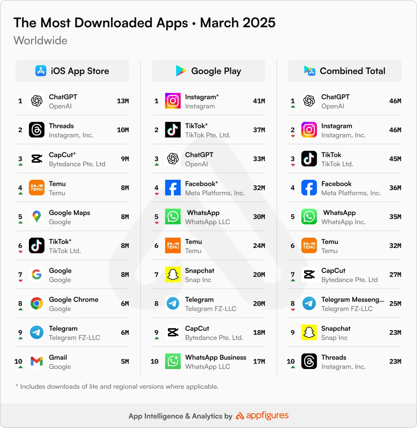 Эта пара очень долгое время занимала первые места, но их царствование, возможно, закончилось. В марте самым скачиваемым приложением в мире стал ChatGPT.