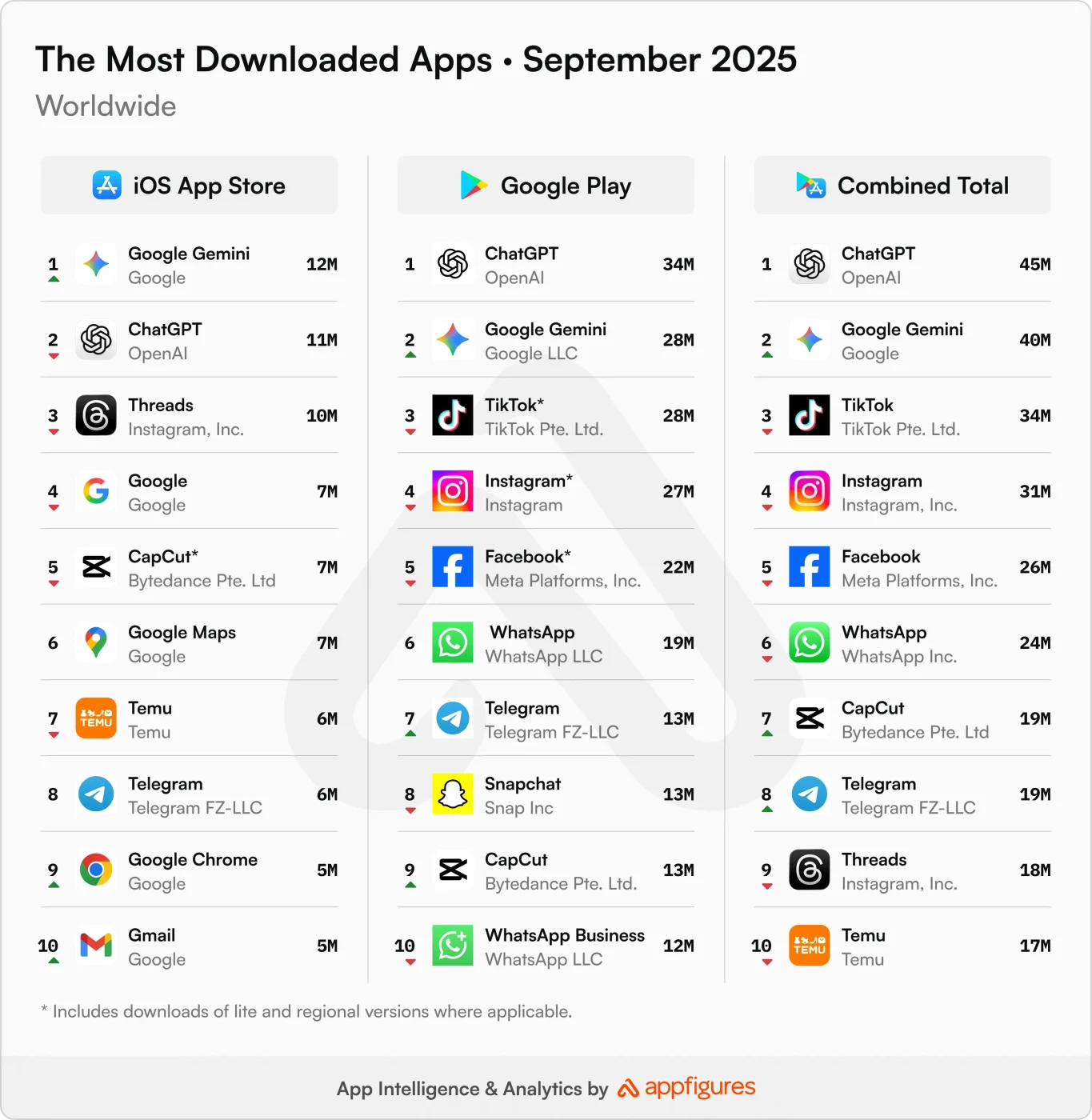 Gemini был близок к этому: в сентябре приложение было скачано примерно 40 миллионов раз, в основном из Google Play. Для сравнения, в августе Gemini загрузили в общей сложности 9 миллионов раз, чего оказалось недостаточно для попадания в рейтинг. Октябрь только начался, а число загрузок уже достигло 7 миллионов, так что, скорее всего, мы увидим его снова в этом месяце.