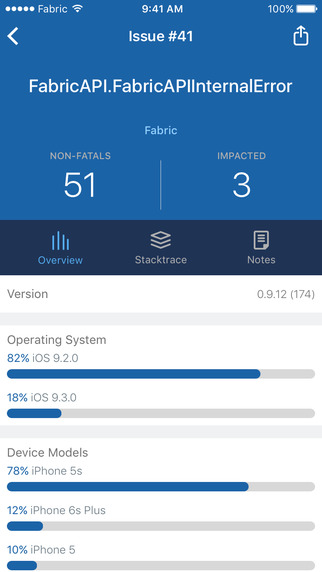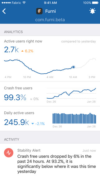 Основа Fabric – сервис Crashlytics, который занимается сбором информации о работе приложений. В частности, с помощью сервиса и приложения вы можете узнать количество активных пользователей, процент пользователей, работающих без сбоев, причины возникновения ошибок, статистику по использованию версий операционной системы и т.д.