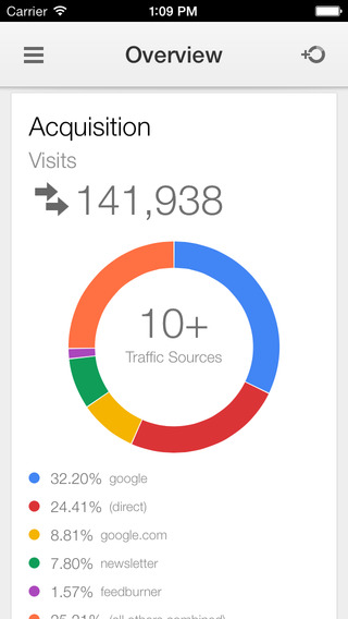 Приложение оптимизировано для iPhone и позволяет вам прямо с мобильного устройства в удобном формате отслеживать статистику посещаемости ваших сайтов и приложений.